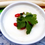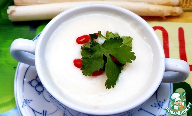 Теперь ставим кастрюлю снова на огонь, доводим до кипения и мешая венчиком вводим мучную пассировку, затем сливки и кусочки спаржи, которые мы выловили, даём ещё раз закипеть. Пробуем на соль, добавляем перчик свежемолотый я для вкуса добавляю ещё сухой концентрированный бульон. Наш суп готов, разливаем в тарелки, посыпаем рубленной зеленью укропа и петрушки.