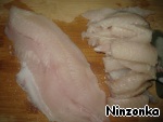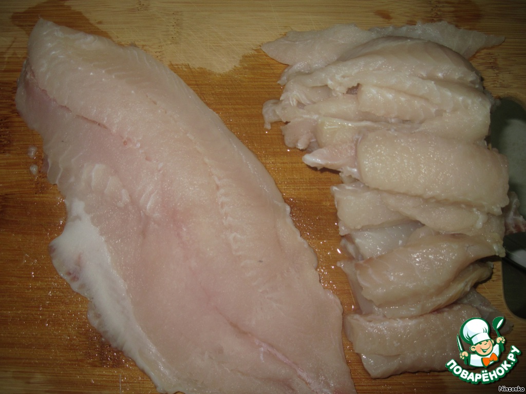 Рыбное филе нарезать на брусочки около 2-3 см длиной.