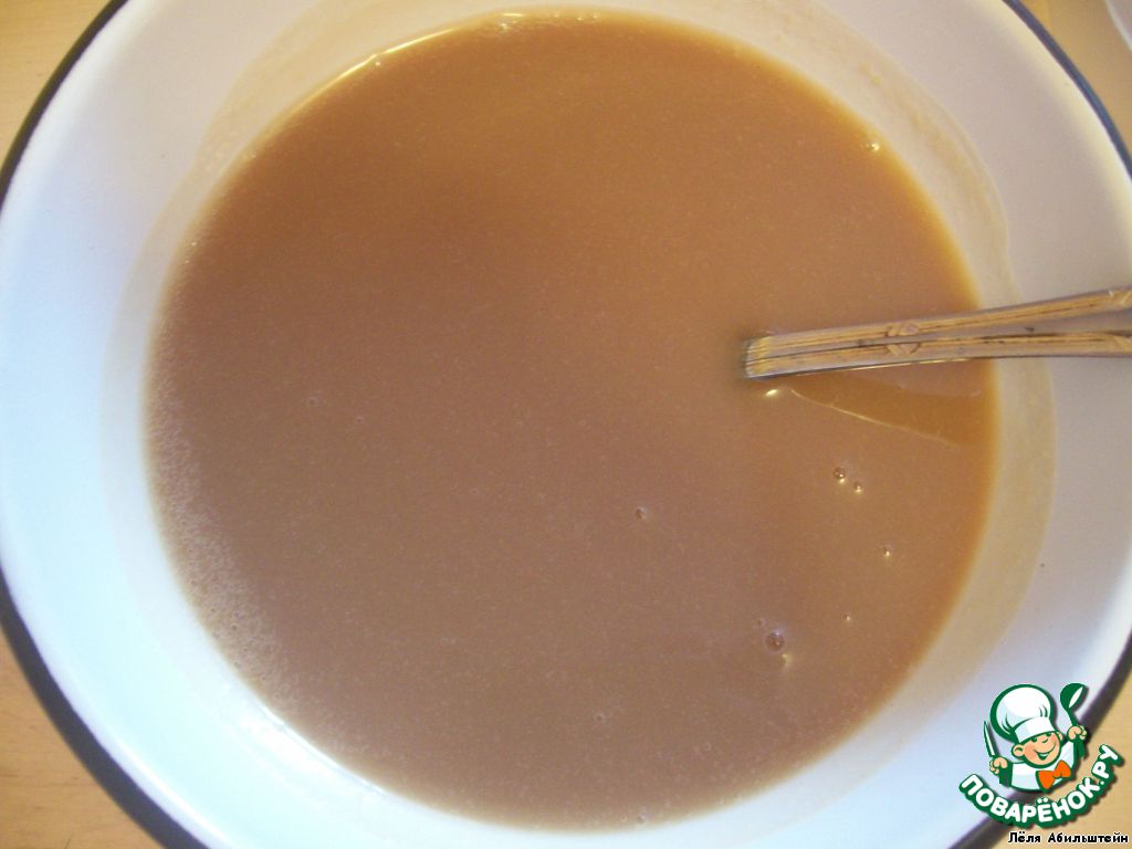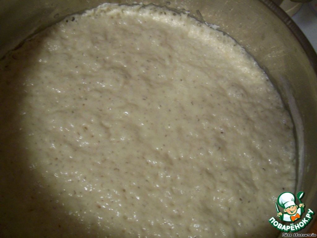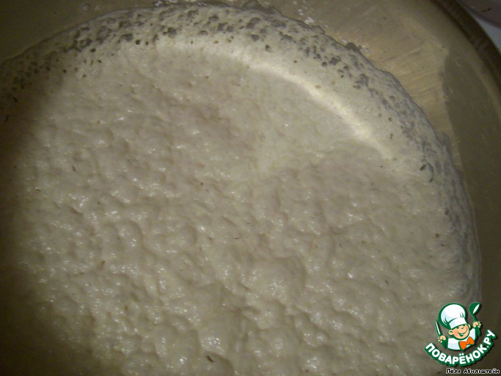 Ставим опару. Смешиваем 700 мл теплого молока, все дрожжи, 1 стакан сахара и 2 стакана муки. Ставим опару в теплое место часа на 3. Она должна подняться и покрыться пузыриками.