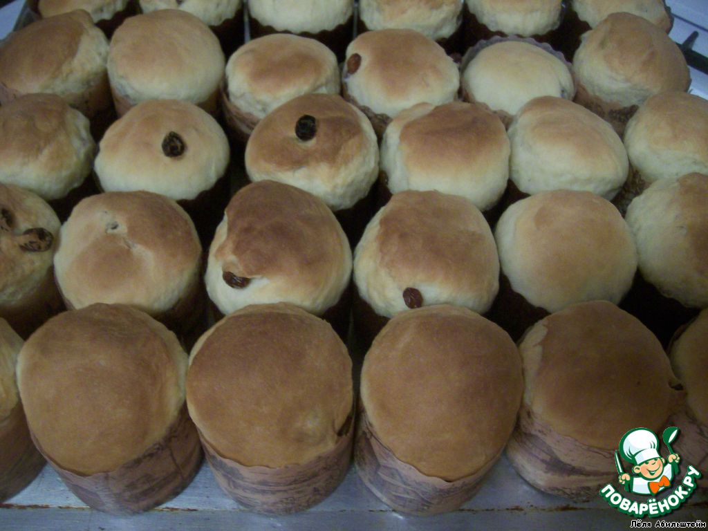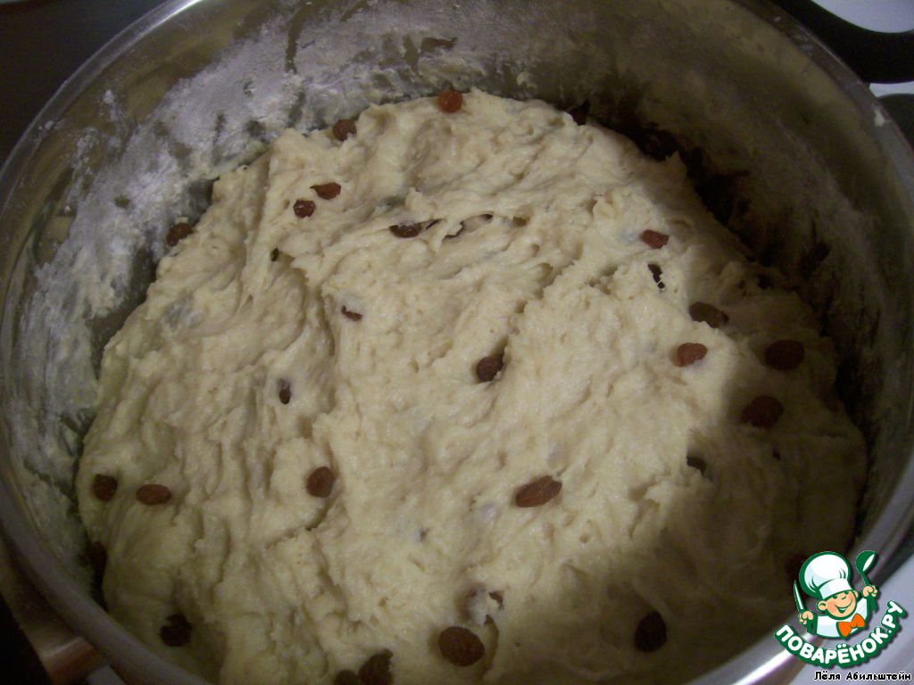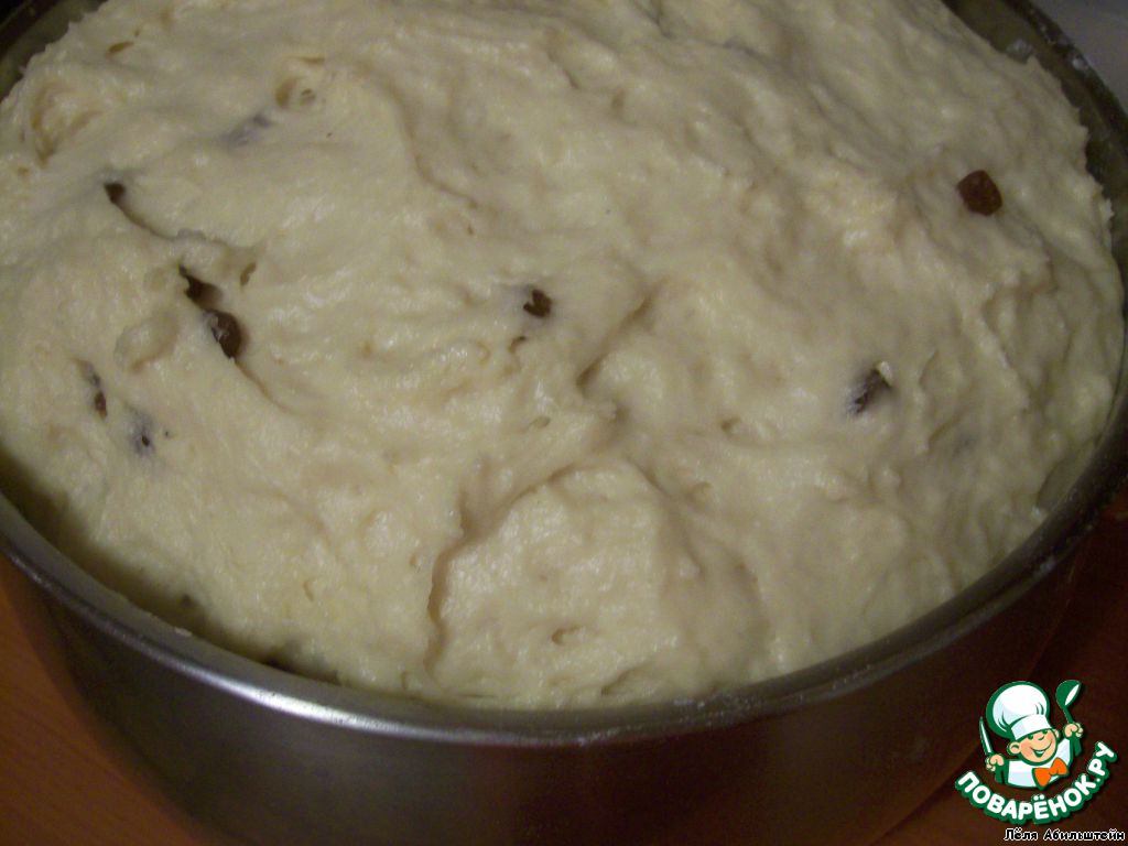 Далее замешиваем тесто окончательно. Добавляем еще один стакан сахара, растопленное сливочное масло, ванилин, растительное масло, сметану, водку, изюм, взбитые желтки и, постепенно добавляя оставшиеся 6 стаканов муки, вымешиваем эластичное тесто. Месим до тех пор, пока оно не будет отставать от рук. Накрываем крышкой и ставим подниматься. Примерно 1 час.