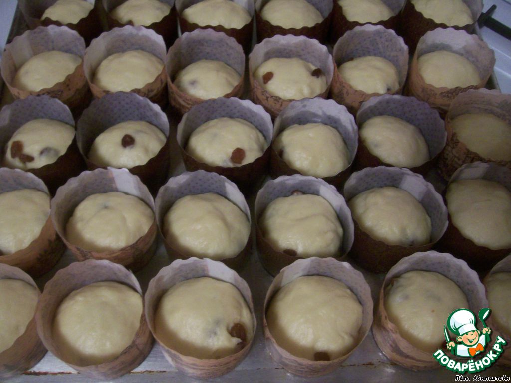 Смазываем маленькие бумажные формочки для выпечки растительным маслом. Из теста катаем шарики и выкладываем в формочки. Формы должны быть заполнены не более, чем наполовину. Из указанного количества ингредиентов у меня получилось 30 штучек бабок.