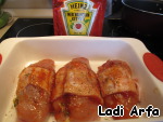 Обернуть каждое филе пластиком бекона и смазать томатным соусом.