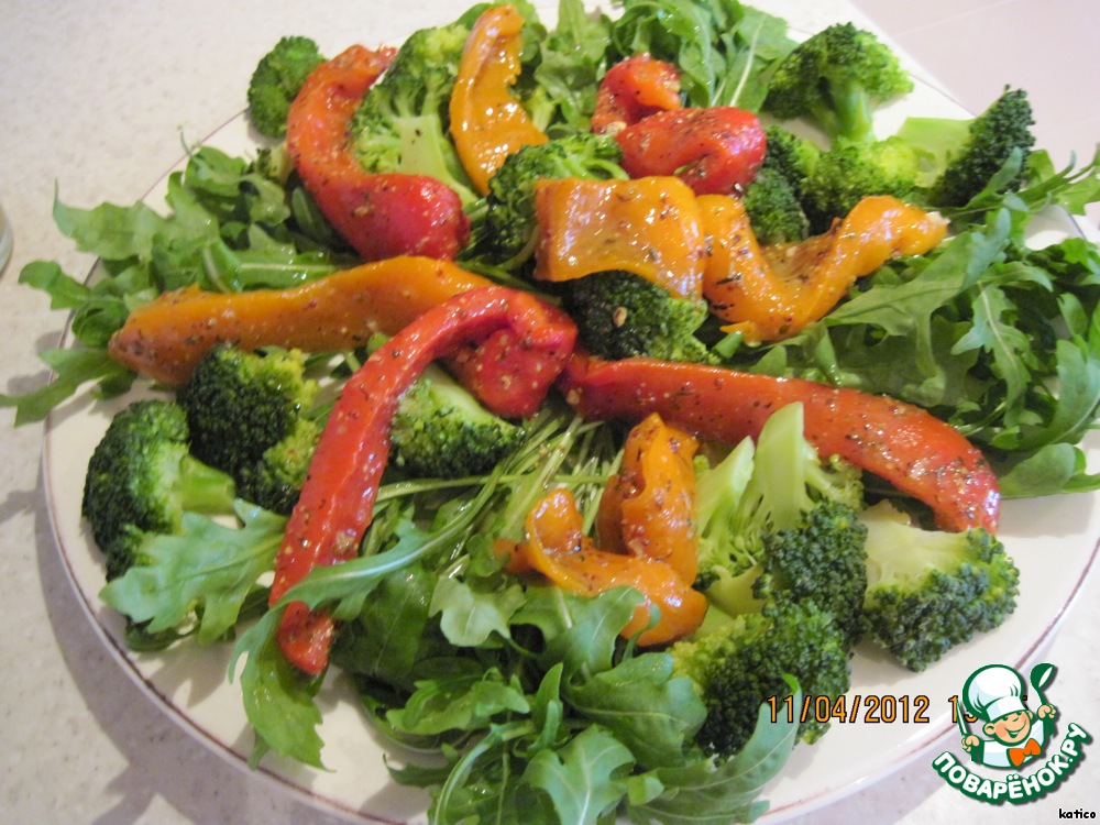 На тарелку выложить секторами рукколу и остывшую брокколи.