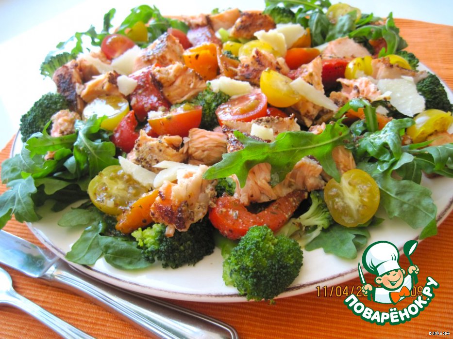 Потом выкладываем рыбу, черри, поливаем заправкой и украшаем пармезаном.