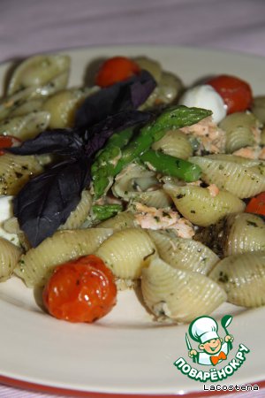 Назвала это блюдо "Морским" из-за лосося и макарон-ракушек, которые являются основной его составляющей. А томаты, спаржа, моцарелла и соус песто так тонко создают аромат морского воздуха... Эх... хочу лето!))))