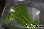 Слить горячую воду и переложить спаржу в ледяную воду, чтобы она осталась хрустящая.