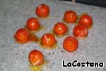 Томаты черри посолить, поперчить, сбрызнуть оливковым маслом и отправить в разогретую до 200 градусов духовку на 5-7 минут.