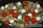 Соединить с пастой томаты и моцареллу. Закрыть крышкой и потушить 2-3 минуты.
