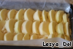 Сверху очищенные и нарезанные небольшими дольками яблоки. Поверх яблок выложить немного джема (для сочности). Но можно и без него.