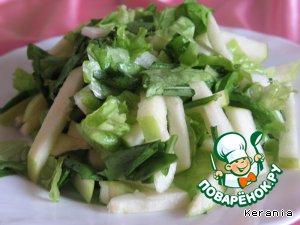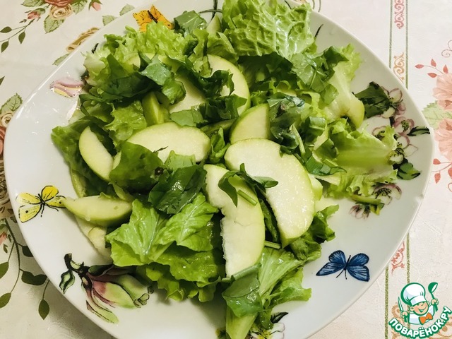 Смешать листья салата, щавель и яблоко, аккуратно перемешать. Для заправки смешать 1 ст. л. лимонного сока и сахар.