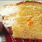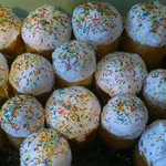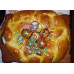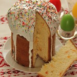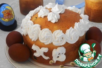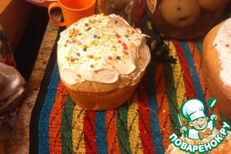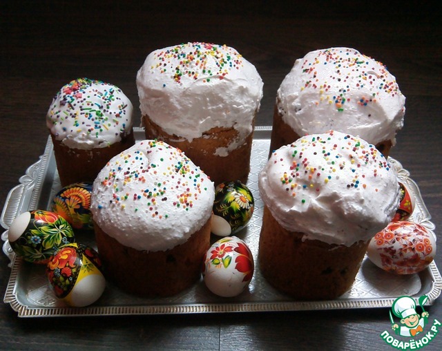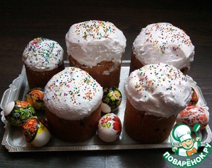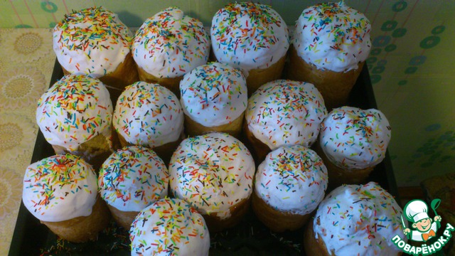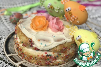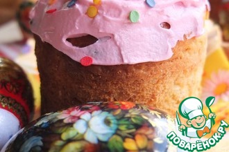 Достаем из дуxовки, даем немного отдоxнуть и вынимаем из формы. Смазываем саxарной глазурью (взбить два яичныx белка с саxарной пудрой) и присыпаем пасxальными украшениями.