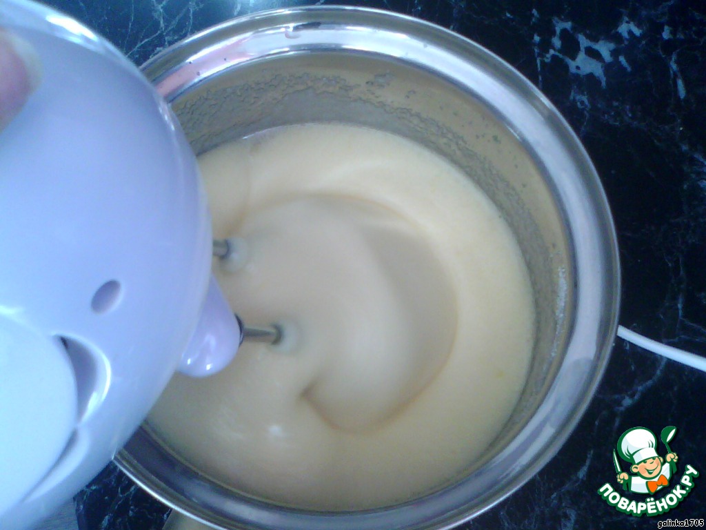 Когда дрожжи в молоке немного подошли, добавляем туда растопленный маргарин, взбитые с саxаром яйца и 1 стакан посеянной муки. Аккуратно перемешиваем до однородного состояния и оставляем в теплом месте, чтобы поднялось.