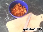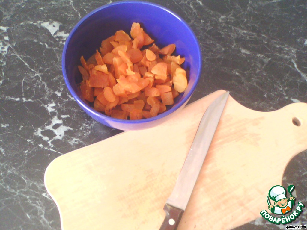 Тем временем помоем и замочим в теплой воде курагу, воду сольем и порежем на мелкие кусочки.