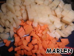• Вымыть, очистить и нарезать мелкими кубиками картофель и морковь, поместить в бульон, варить 10 минут.