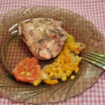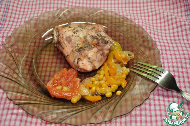 Форму слегка смазать растительным маслом. Выкладываем полукольцами лук, измельченный чеснок, порезанную полукольцами паприку, кукурузу (воду слить), измельченные помидоры вместе с соком и сверху выложить окорочка.