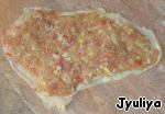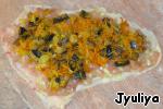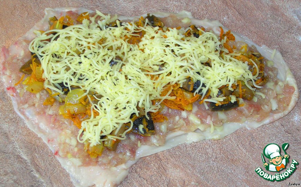 Я собираю кожу, когда разделываю курицу. Потом на кожу выкладываю фарш куриный, грибы с луком и морковью и сыр. Все это заворачиваю в кожу. Получается вот такой рулет!