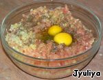 • Посолить, поперчить, добавить яйца, тщательно перемешать.