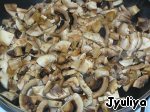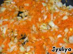 • Морковь натереть на мелкой терке, лук нарезать, обжарить на растительном масле. Смешать грибы с луком и морковью.