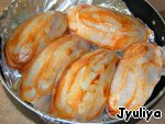 • Готовые рулеты выложить в форму. Смазать сверху (майонез+кетчуп). Запечь в горячей духовке 30-35 минут.