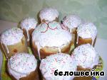 Когда куличики остыли, смазала их глазурью и посыпала кондитерской посыпкой. Глазурь - на 1 белок 0,5 стакана сахарной пудры, хорошо взбить венчиком.