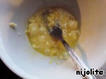 Тем временем готовим соус. Заранее сварить три яйца вкрутую. Теперь берём варёные желтки, разминаем и тщательно смешиваем с тремя сырыми желтками. Продолжая мешать, добавить растительное масло. Получится как майонез.