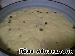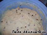 Теперь замешиваем тесто окончательно. Добавляем в него растительное масло, растопленное сливочное масло, ванилин, взбитые желтки, 4 стакана сахара, сметану, водку, засыпаем изюм. Все время тщательно размешиваем.