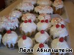 Глазируем наши куличи помазкой. Я использовала для этого жесткую кулинарную кисть. Сверху украшаем, кому как нравится. Я часть куличей посыпала кондитерской посыпкой, а часть украсила коктейльной вишней.