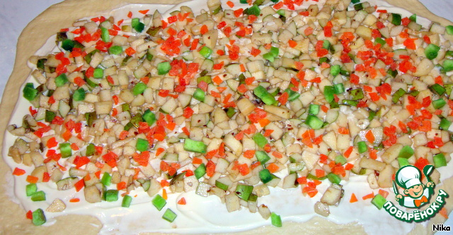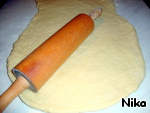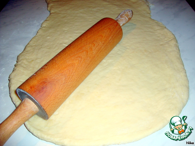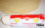 Творожной массой (300 г) обмазать раскатанное тесто.