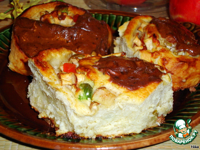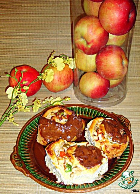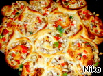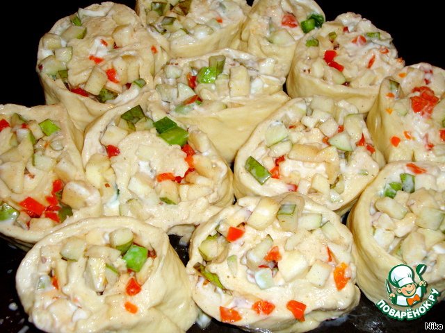 Рулет желательно нарезать на 16 булочек. Я спешила и у меня получилось только 12 штук. Поставить в горячую духовку на 30-35 минут при температуре 200 градусов.