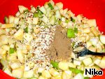 В фрукты насыпать 100 г сахара, 1 ч.л корицы, 30 г молотого миндаля. Если Вы любите послаще, тогда сахара можно положить больше.