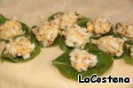 В формочки для пельменей выкладываем свежий листик шпината, а на него небольшое количество начинки.