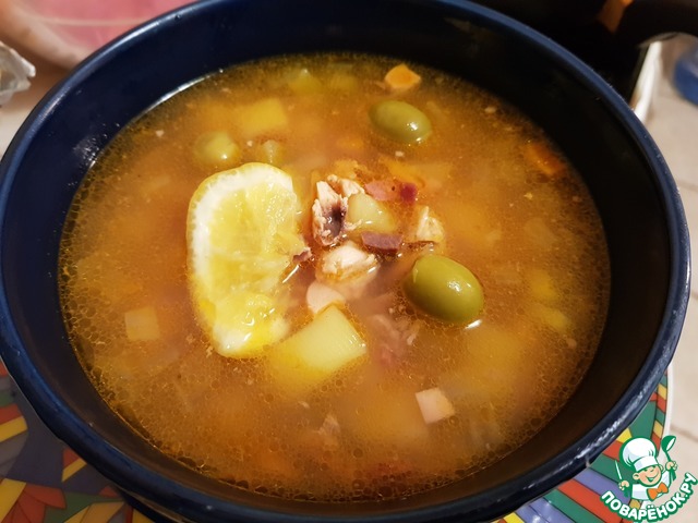 Солим воду (после того как положили всe мясное и огурцы) по вкусу и после закипания добавляем оливки, маслины и обжаренную луково-томатную смесь.