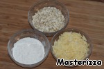 • Добавляем масло, нарезанное кубиками, и перетираем все вместе. Вливаем молоко, всыпаем тертый сыр.