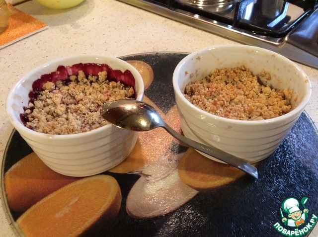 • Сверху посыпьте крошкой. Выпекайте при 180 град. минут 20-25 до румяной корочки. Выньте из духовки, немного остудите и подавайте в теплом виде с шариком мороженого или взбитыми сливками.