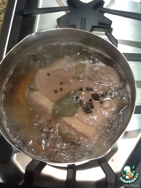 Варим говядину. В воду я добавила перец горошком, лавровый лист и соль.
