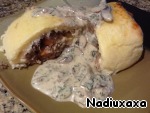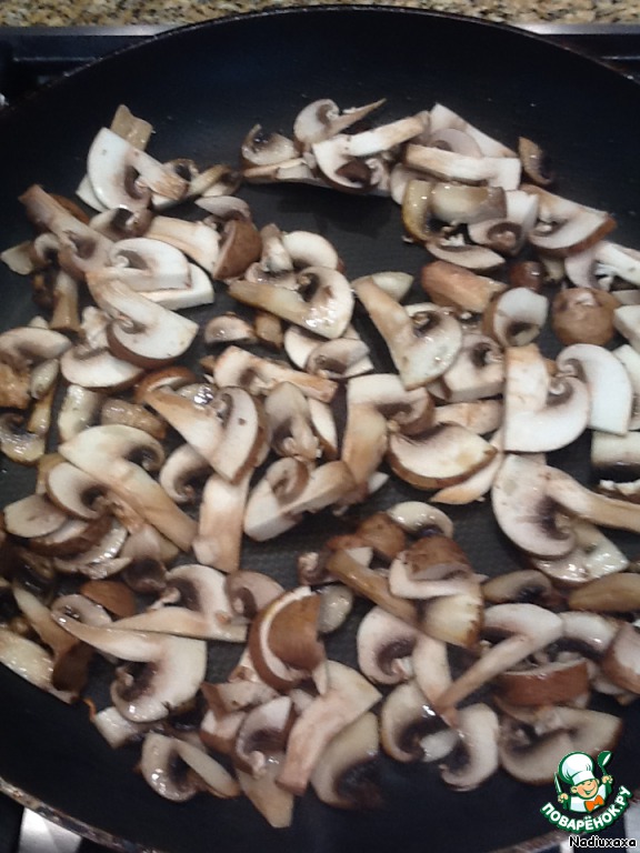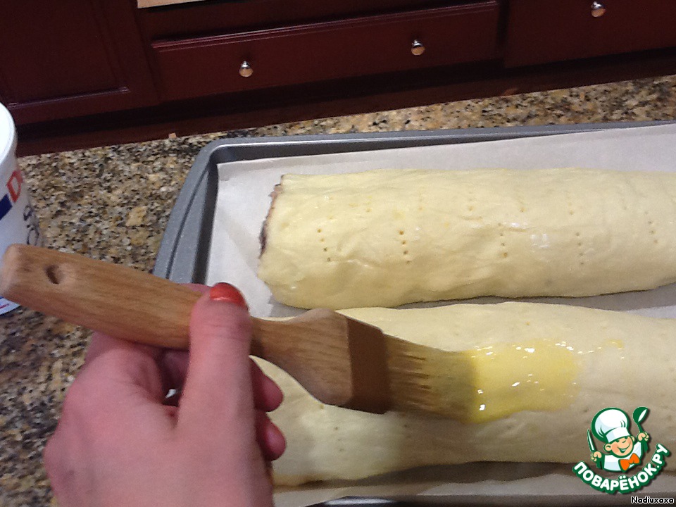 У меня рулет получился длиннее противня, поэтому я его разрезала на 2 части. Кладем рулет на противень, предварительно выложив пекарской бумагой. Рулет смазываем яйцом. И ставим в духовку где-то на полчасика. Пока рулет печется, готовим соус с грибочками. Его делать необязательно, отлично подойдет и сметана, но я люблю этот соус. Быстро и просто.