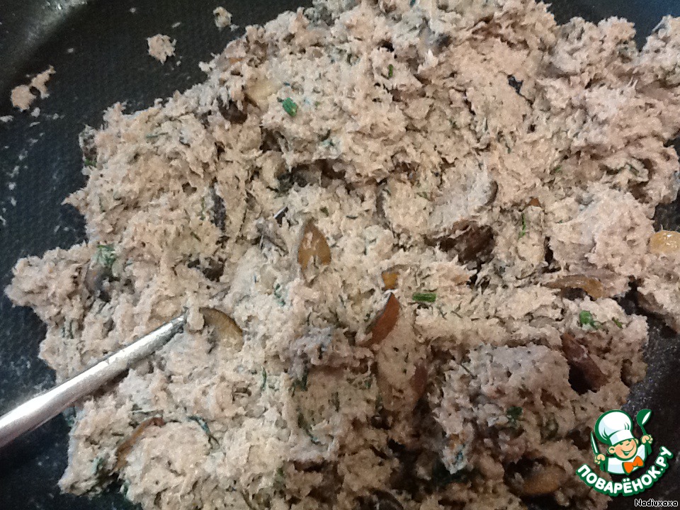Остывшую говядину перемалываем в блендере с обжаренным луком. Затем добавляем специи по вкусу, бульон или воду для сочности (я добавила бульон, оставшийся после варки мяса), обжаренные грибочки и зелень. Вот такая начинка получилась у меня.
