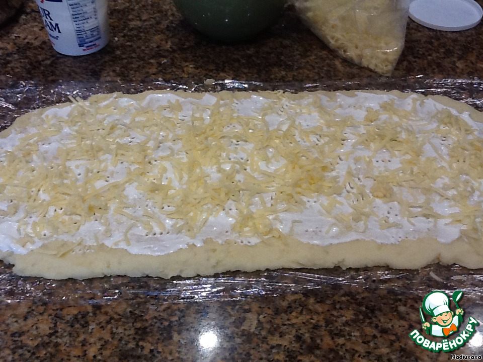 Картофельную массу раскладываем в овал толщиной около 2 см. Прокалываем вилкой, смазываем сметаной и присыпаем тертым сыром.