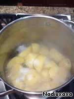 Когда картофель сварится, сливаем воду и ставим обратно на плиту на 5 минут на средний огонь. Постоянно помешиваем. Это чтобы лишняя жидкость выпарилась. Затем картофель растираем и оставляем остывать.