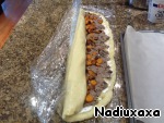 Затем выкладываем мясо и морковь. И аккуратно заворачиваем в рулет. Вот так.