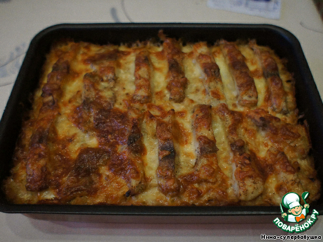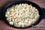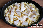 Форму для запекания смазать маслом и выложить поочерёдно: