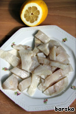 Филе рыбы нарезать полосками и сбрызнуть лимонным соком.