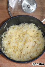 Добавить капусту с яблоками к тушеному луку, перемешать и продолжать тушить всё вместе под крышкой 15 мин., периодически помешивая.