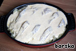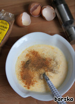 Заливка: смешать яйца, сметану и водку. Приправить солью, перцем и молотым мускатным орехом.