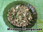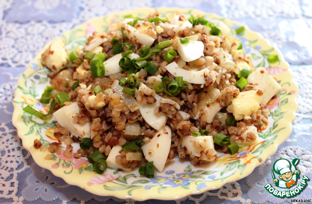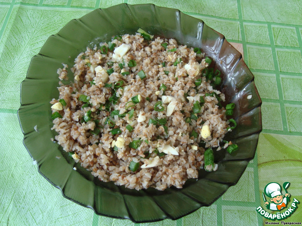 Пока готовится гречка, в 2 -3 ст. л. масла обжариваем лук и чеснок (мелко порубленные, можно и без чеснока). В еще теплые лук с чесноком добавить яйца и перемешать все с гречкой.