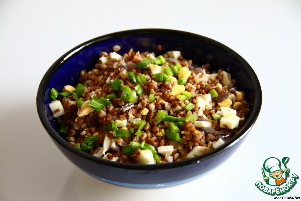 Соль по вкусу, я солю гречку, поэтому больше еe в блюдо не добавляю. Подавать можно с зеленым луком. Как вариант, к луку и чесноку можно добавить грибы.