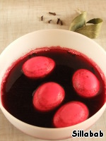 Яйца отвариваем вкрутую. Пока идет процесс варки, выжимаем сок свеклы. Из трех небольших свеколок у меня получилось вот такое количество сока. Я добавила немного воды, чтобы получить полный стакан.