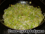 На той же сковороде слегка обжарить нарезанный полукольцами порей.