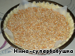 Тесто слегка раскатать, выложить в форму (в 26, глубина 4 см), смазанную маслом, размять по всей форме, сделав высокие бортики. Застелить пекарской бумагой, высыпать сухой горох и поставить в духовку на 15 минут.