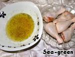 В глубокую миску налить вино, добавить цедру апельсина, измельченный чеснок, перец черный горошком, петрушку. Хорошо перемешать. Голени слегка посолить и поперчить.